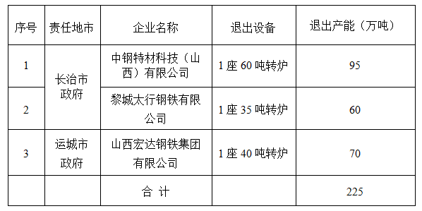 一、长治市:退出中钢特材科技(山西)有限公司1座60吨转炉,压减95万吨粗钢产能;退出黎城太行钢铁有限公司1座35吨转炉,压减60万吨粗钢产能。